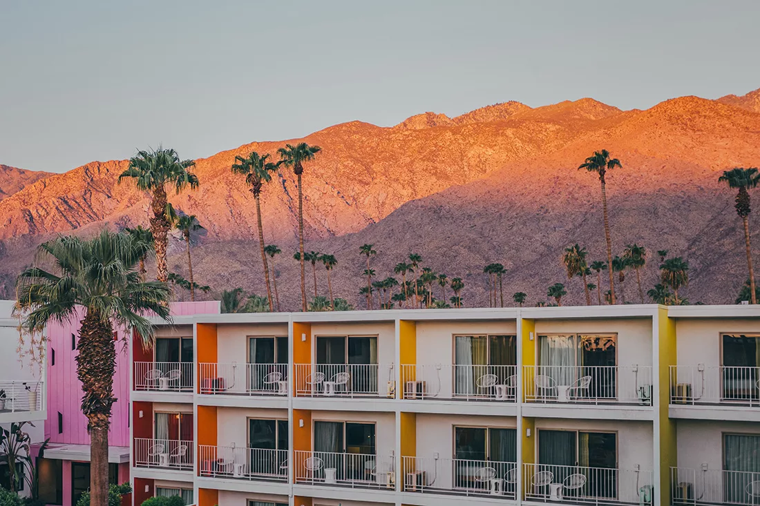 Hotel The Saguaro con fachadas multicolores rosa naranja y amarilla al atardecer, palmeras del desierto y montañas San Jacinto iluminadas en tonos cálidos en Palm Springs California